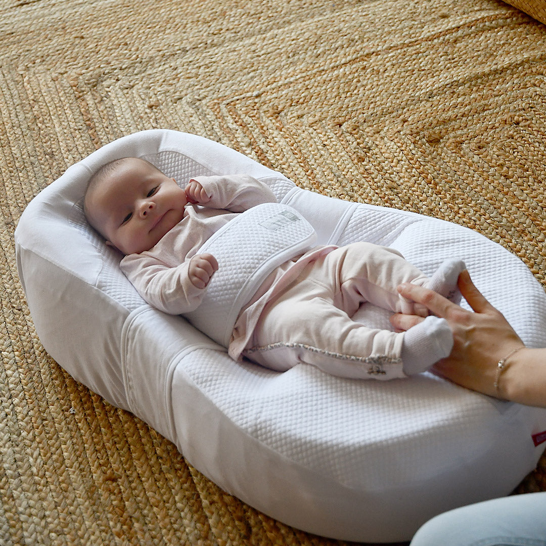 COCOONABABY® bebek yatağında, bebek toparlanmış bir pozisyon alır, omuz ve omurgası hafif yuvarlak olarak yarı cenin pozisyonunda yatar.